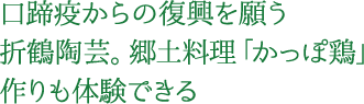 食の体験では、地頭鶏を使った「かっぽ鶏」作り。青竹に詰めて煮ることで絶妙な香りが楽しめる。交流会の箸がすすむこと間違いなし。工芸体験は、口蹄疫復興を願った折鶴陶芸を作ることができる。時間の都合上、折るところまでしか体験できないが、乾燥・焼成後に自宅まで届けてくれる。