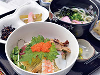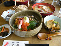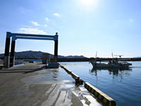 目の前にある目井津漁港直送の食材を使った料理を堪能できる食事処。特におすすめは海鮮丼と魚うどんがセットになった「よくばり膳」。魚うどんは、ハモやタイなど新鮮な白身魚を使ったこだわりの逸品で、宅配やお持ち帰りもできる。